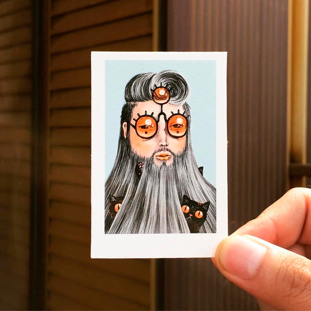 Nef Espino, a través de su proyecto Lepapel, jugando al explorador de una isla ficticia -Isla Palmas de Gran Panaria-, nos presenta parte de esa mitología que ha desarrollado de su mundo personal, que extiende ante nosotros quienes lo contemplamos; así, los personajes que aparecen en «Carta de Visita», son el reflejo de sus idealizaciones, la materialización de sueños y fantasías. Seres como Santa Catarata de los 8 Dolores, con sus lágrimas dulces que dan vida a la flora de la isla, o Frandando Prado y sus gatos negros que ayudan a sanar decepciones amorosas, o la divina criatura Jiraguana Unicornia, nos hablan de esas concepciones que su autor, cual ente todopoderoso, aprehende, casi inconscientemente, de la realidad que experimenta en su cotidianidad, una, sin duda, llena de magia. Imitando a los retratos fotográficos del siglo XIX, en donde los individuos posaban de una manera solemne y aurática, este conjunto de ilustraciones digitales, son confeccionadas desde una contemporaneidad que se vuelve atemporal, subrayando la condición fantástica de la que parten.