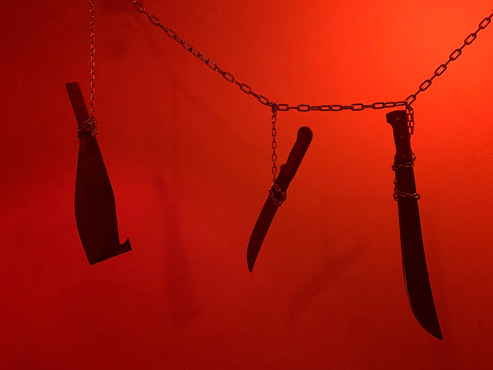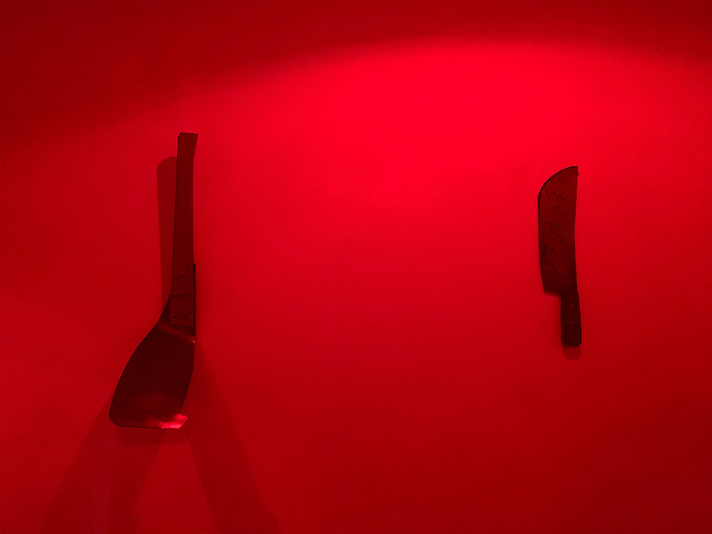 Vegan Cannibal nos ofrece, con esta instalación artística en Transliterado, otro acercamiento a su particular concepción de lo contemporáneo: lo gore, visceral, la violencia gráfica, entre otros aspectos que conforman su obra, ocultan tras de sí una crítica directa a los modos de las sociedades actuales. Cuchillos y machetes, despojados de su destino esperado, son grabados con grafismos que simulan rayos (elementos de la naturaleza que connotan empoderamiento), para con ellos, enfrentar la aspereza de lo cotidiano.