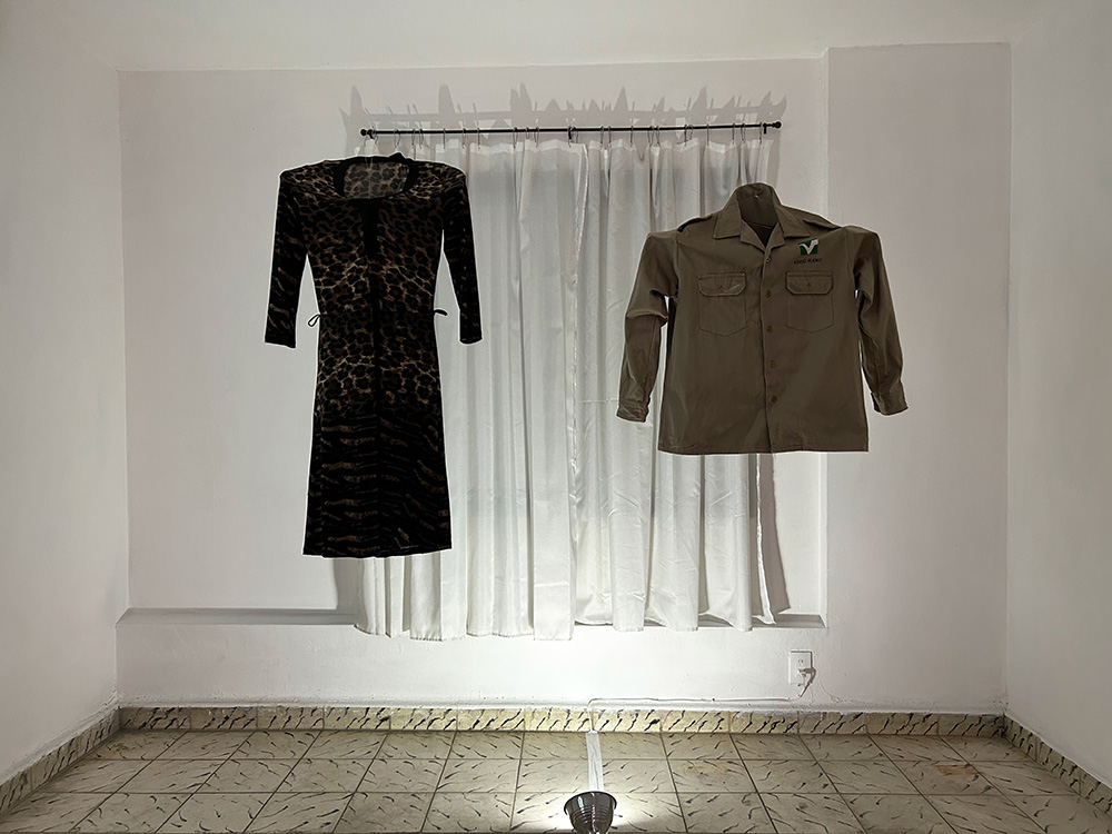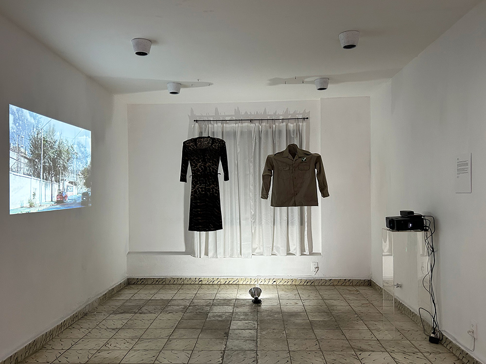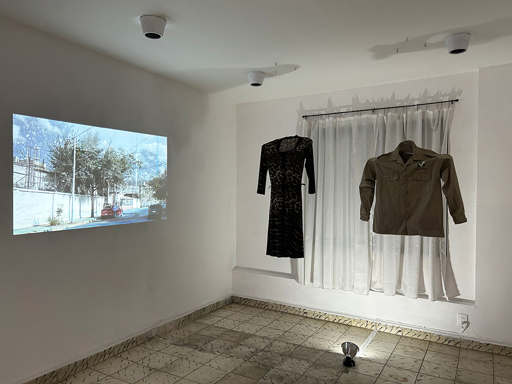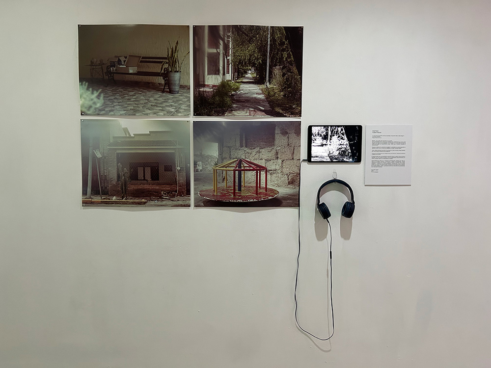 Daniel Loa participa con una instalación en la que un par de prendas de vestir permanecen suspendidas en uno de los extremos de la sala expositiva, mientras un video es proyectado y se escucha un collage sonoro; dichas prendas, antaño pertenecientes a sus padres, son el contenedor de recuerdos que empujan al artista a indagar en su memoria emociones que lo vinculen a su presente, al registrar en video espacios que solía visitar con sus seres queridos, exponenciando la sensación con una melodía que escuchaba en su niñez en su ambiente familiar, mezclada con el registro ambiental de los espacios resignificados. De cierta manera, se gesta un puente, no solamente conceptual sino estético, con el proyecto de Anabel Palacios, en el que una serie de fotografías, acompañadas por sonoridades, aluden también a espacios significativos en los que su padre habitaba; fotografías atendidas con un dejo de tratamiento cinematográfico, con una paleta de color casi melancólica y nostálgica. Anabel nos comparte una consecuencia de ausencias que se perciben tan familiares como la historia misma de su autora.