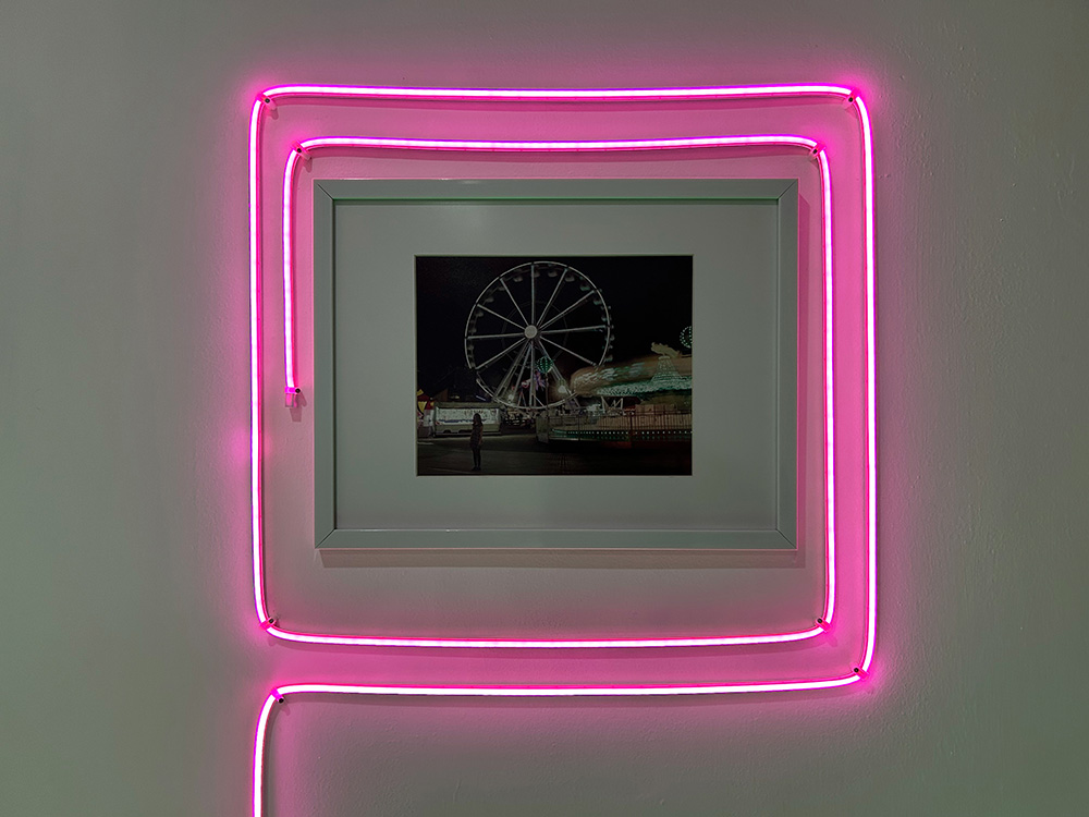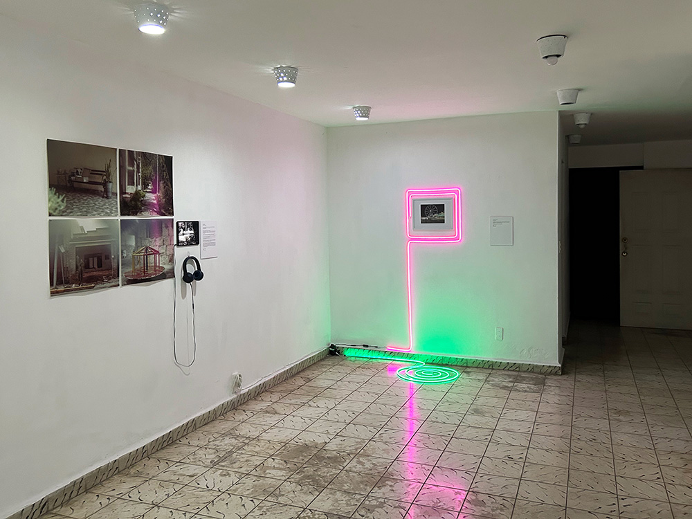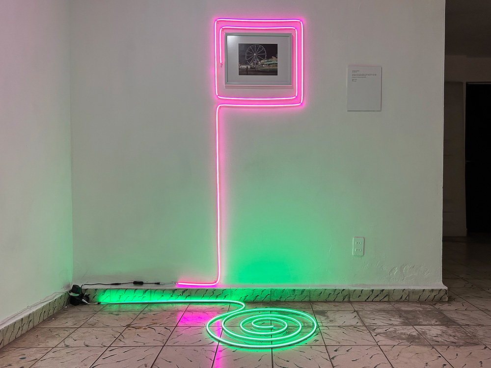 Cierra el ejercicio el trabajo de Ale Sobrevilla, en donde una fotografía montada al centro de la pared, es subrayada por luces neón características de las ferias al aire libre. Anclada desde la historia de una decepción amorosa, Sobrevilla nos comparte su proceso de autoreconciliación y autoconocimiento, a través de una composición fotográfica en donde una figura humana, ella misma, se mantiene casi inmóvil ante un escenario en movimiento, capturado por la lente fotográfica y gestado cual barridos. Las luces neón enmarcan una declaración intrínseca a la intencionalidad de la imagen, celebrar los vaivenes de la vida. Es así como estas tres propuestas se enlazan para invitarnos a pensar la noción de ausencia, abordada desde la memoria, como una condición presente en el ser y estar de las subjetividades humanas.