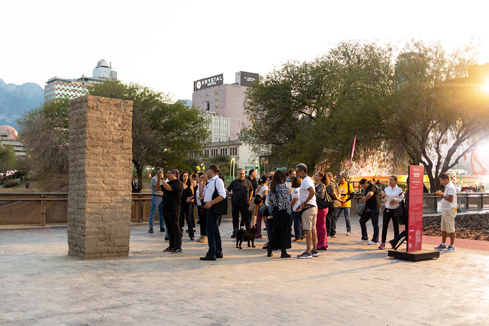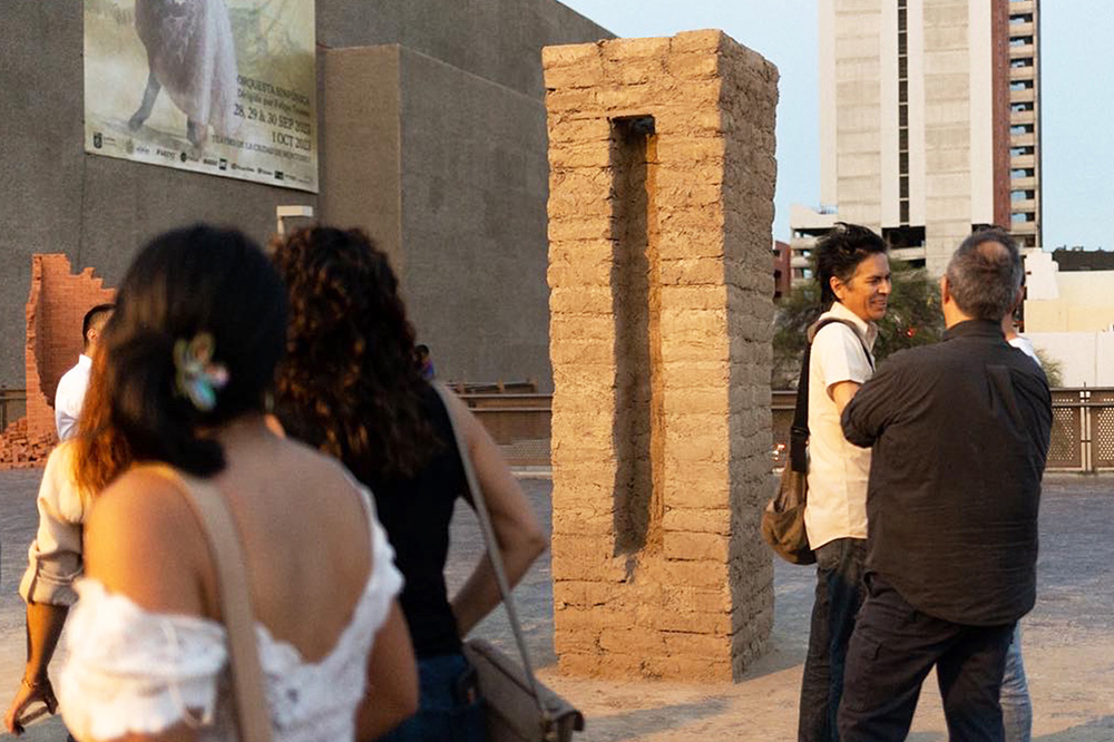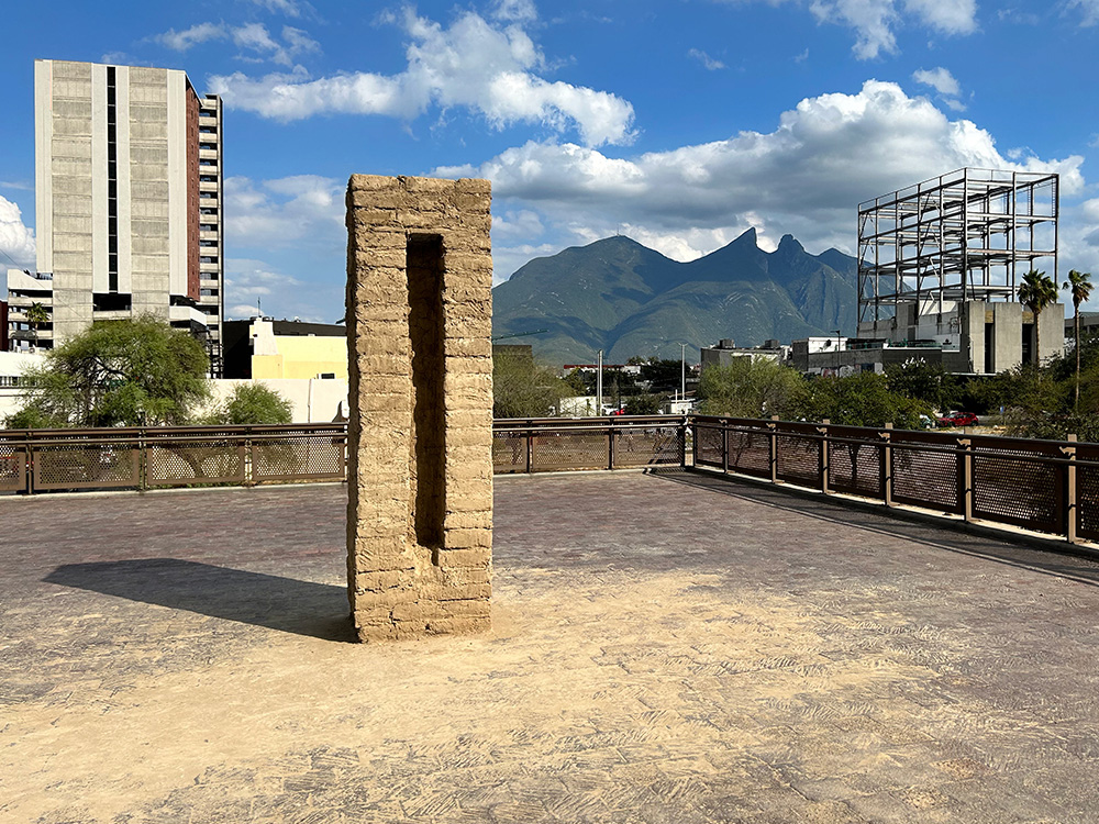 A partir de la producción de bloques de adobe -un material de construcción desde hace tiempo menospreciado, a pesar de las ventajas y bondades en relación a las condiciones climáticas de la región noreste de México-, realizada por un artesano experimentado, se construyó esta escultura pública que, además de subrayar el abandono del uso del adobe y las técnicas artesanales, nos enfrenta al reconocimiento del constante deterioro que sufren las edificaciones históricas no solo de la ciudad de Monterrey y su área metropolitana, sino en otras partes del estado de Nuevo León.