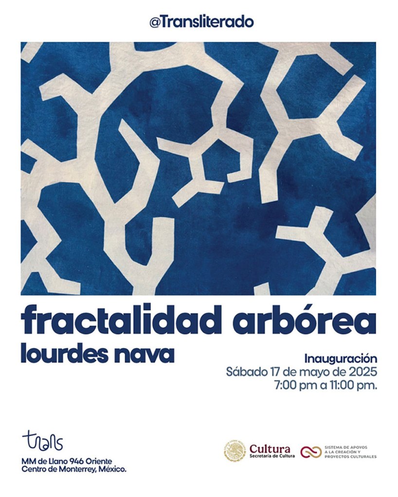 Texto curatorial para la exposición individual «Fractalidad Arbórea», de la artista Lourdes Nava, que se presentó del 17 al 24 de mayo de 2025, en el espacio independiente de arte Transliterado, en Monterrey, Nuevo León, México.