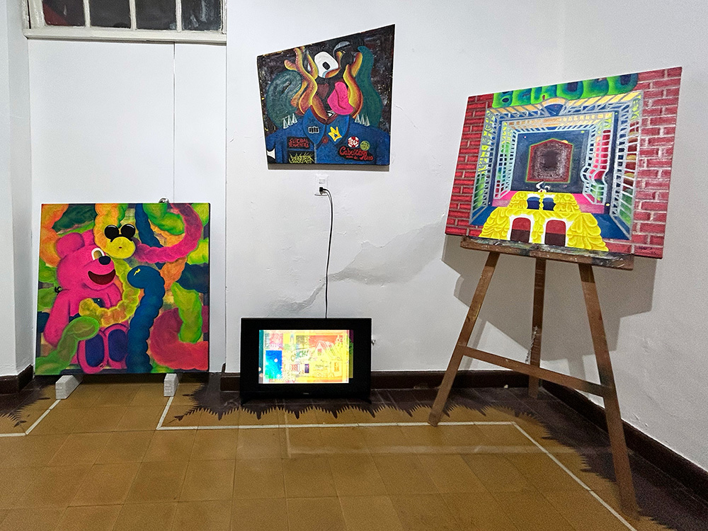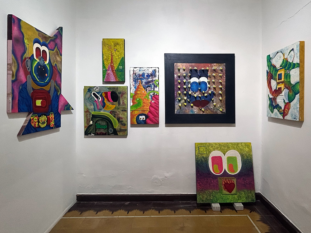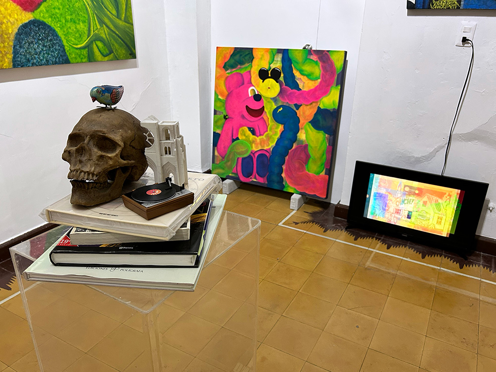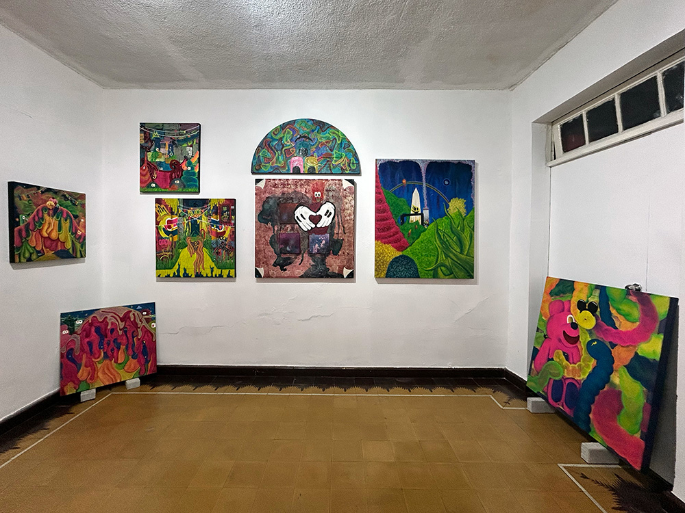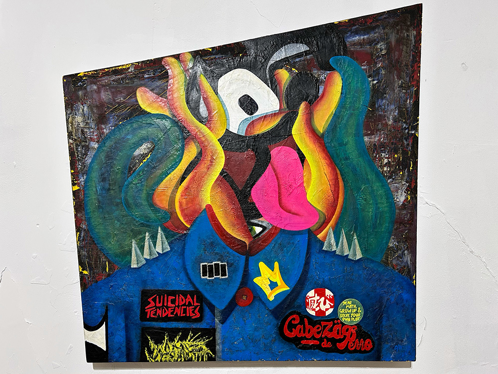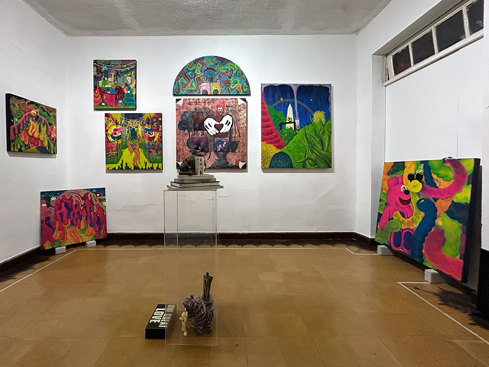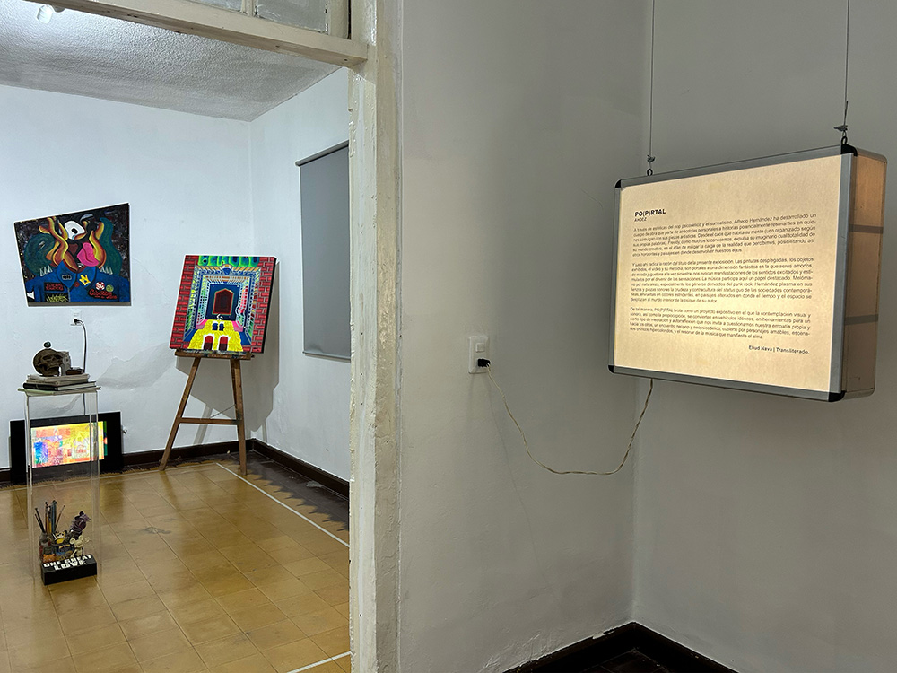 Y justo ahí radica la razón del título de la presente exposición. Las pinturas desplegadas, los objetos exhibidos, el vídeo y su melodía, son portales a una dimensión fantástica en la que seres amorfos, de mirada juguetona a la vez siniestra, nos evocan manifestaciones de los sentidos excitados y estimulados por el devenir de las sensaciones. La música participa aquí un papel destacado. Melómano por naturaleza, especialmente los géneros derivados del punk rock, Hernández plasma en sus lienzos y piezas sonoras la crudeza y contracultura del status quo de las sociedades contemporáneas, envueltas en colores estridentes, en paisajes alterados en donde el tiempo y el espacio se desplazan al mundo interior de la psique de su autor.