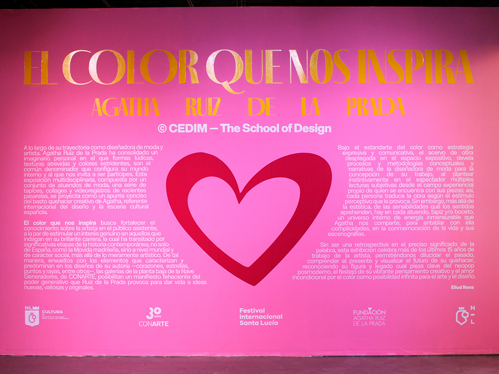 Textos curatoriales para la exposición de Agatha Ruiz de la Prada «El Color Que Nos Inspira», realizada para CEDIM – The School of Design, en el marco de actividades del Festival Internacional Santa Lucía 2025, con el apoyo de Fundación Agatha Ruiz de la Prada, CONARTE y Secretaría de Cultura de Nuevo León. Nave Generadores, del Centro de las Artes, CONARTE. Monterrey, Nuevo León, México. Del 28 de octubre de 2025 al 22 de febrero de 2026.